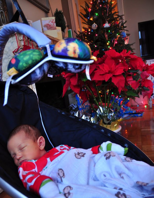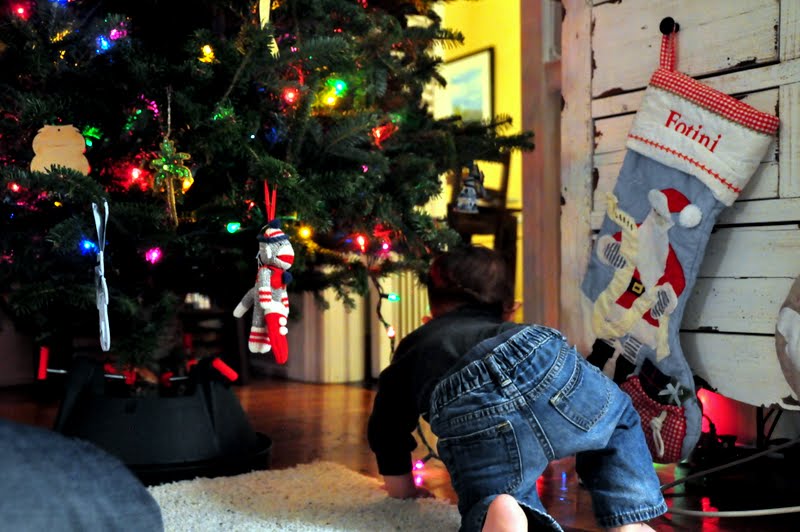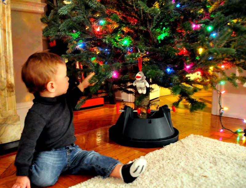 Adam’s favorite thing to do is grab this sock monkey off the tree and then try to put it back on.  It’s the cutest thing I’ve ever seen!