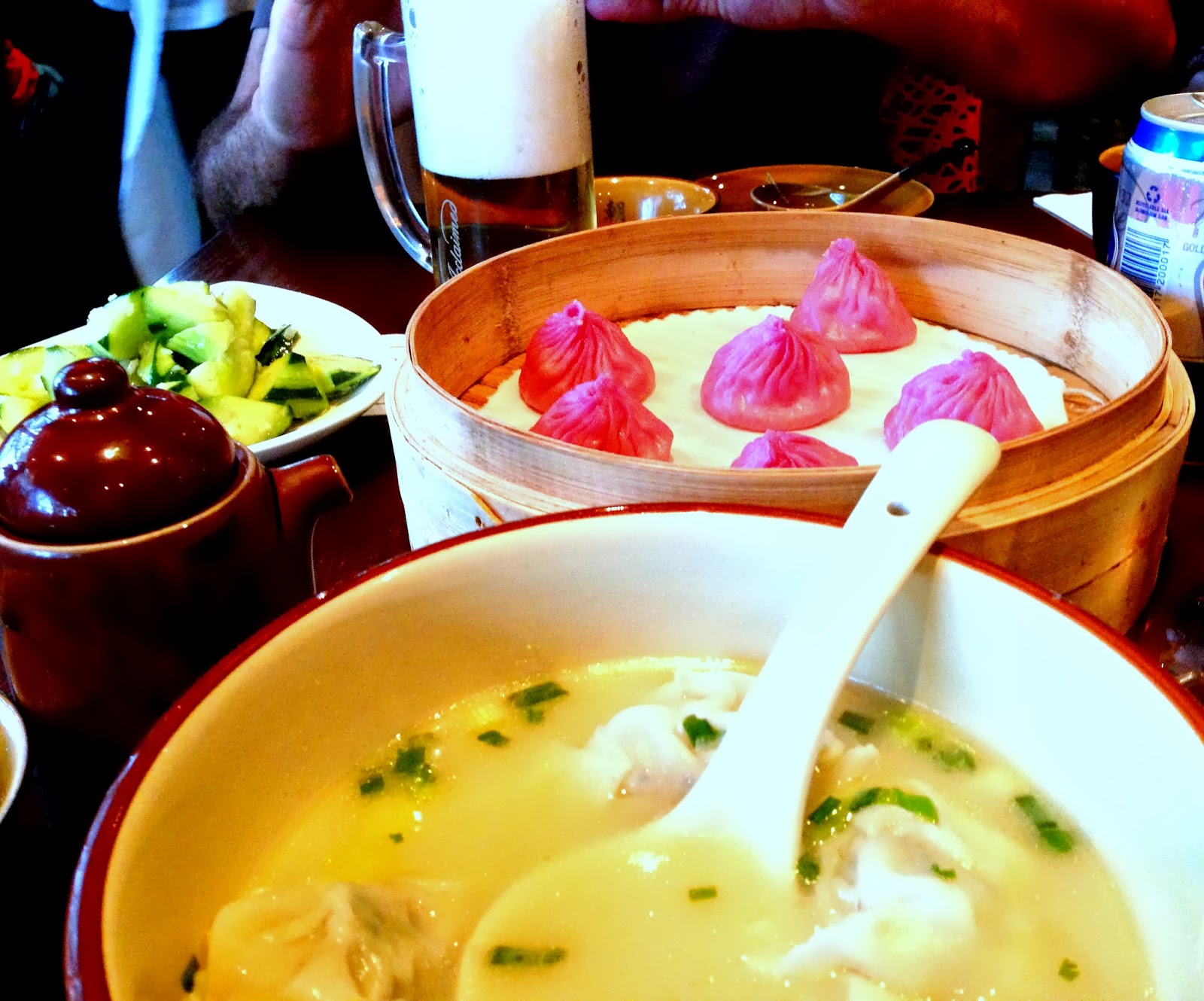 Soup dumplings in the back, garlic cukes on the left and yummy dumpling soup front and center. All delicious. The original soup dumplings (not pictured, like the pink ones below but white) were in Randy’s top three..this makes four but who’s counting right?