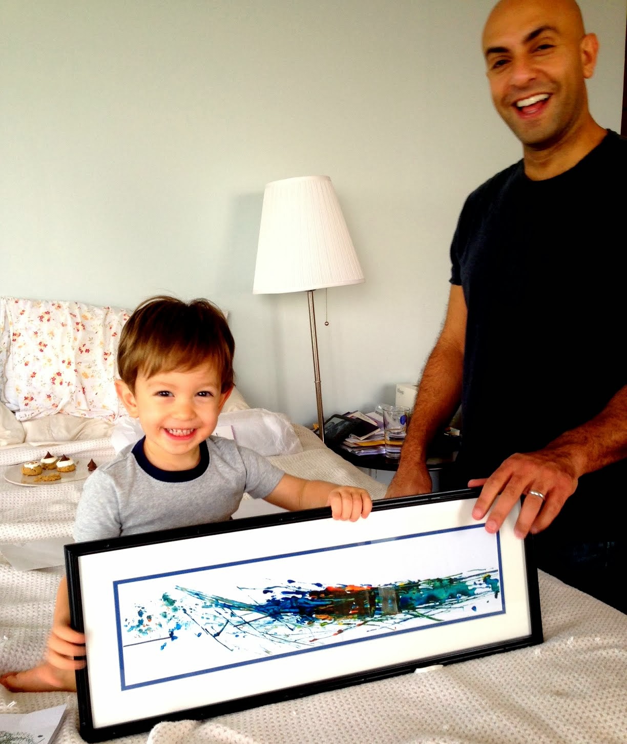 Adam framed his first painting to give Randy for his office at work.  Since Adam was about six months old Randy has been asking when he’ll be able to have some art work by Adam for his office.  Well, it’s finally time!  Adam made it at school using a plastic car that he dipped in paint and rode on the paper.