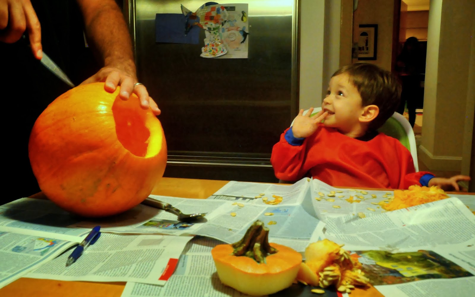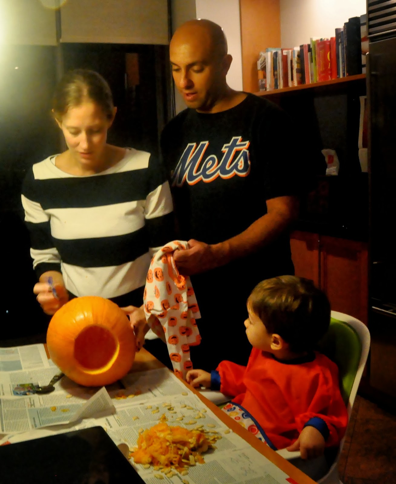Adam has been obsessed with pumpkins. Aunt Sandra sent him some pumpkin pajamas and it’s been love ever since. He wants to wear them every night! So we decided to try pumpkin carving with him.