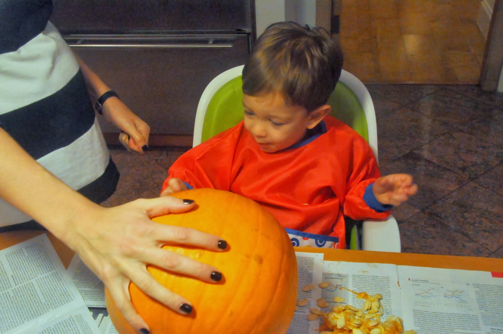 Adam helped me pull all the seeds out of the pumpkin.