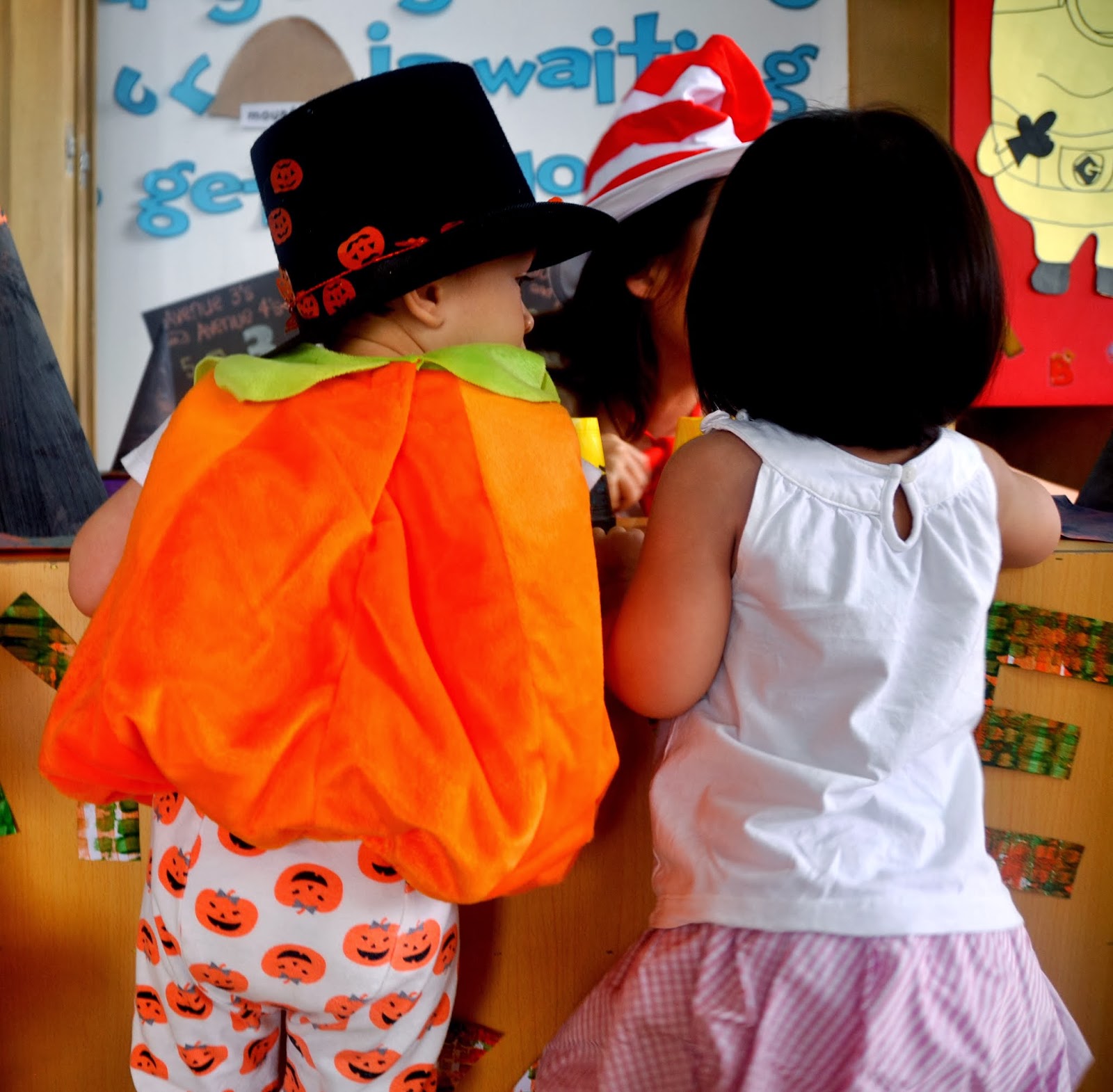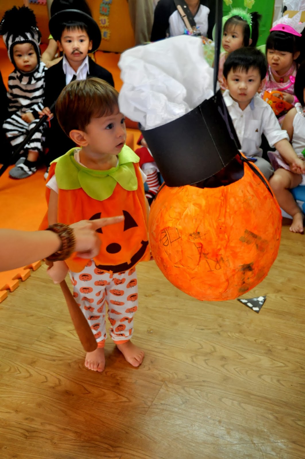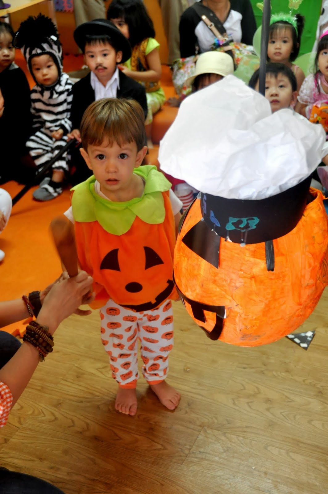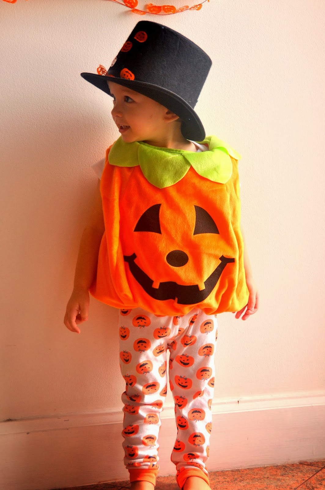 His first party was at school and the theme was hats so he made a special hat just for the party to wear with his costume. I’ve never seen a cuter pumpkin. He loved his costume which was great because he kept it on.