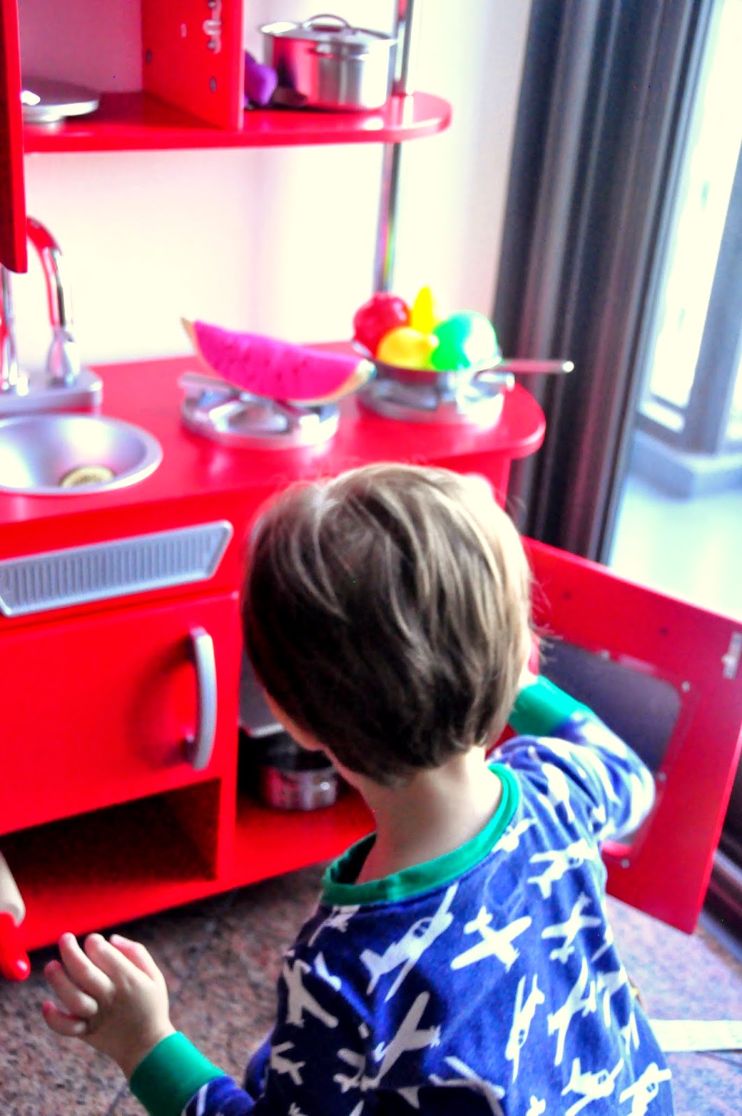 For Easter the Easter Bunny brought Adam a kitchen. The Easter Bunny (aka Amazon) was a bit late so it finally arrived last week and then the Easter Bunny’s helper aka mommy had to find three hours to put this beast together. Note to Easter Bunny, for Easter next year mommy wants you to assemble all toys. At least I had the cutest assistant.