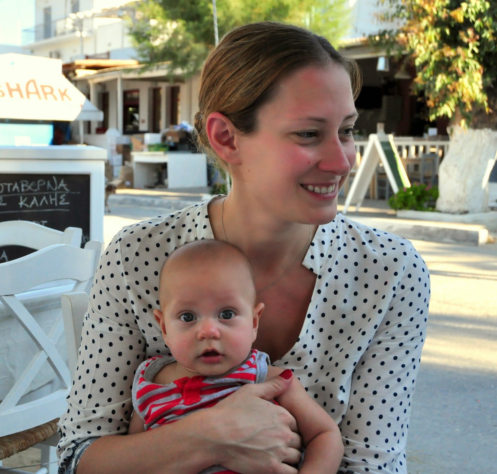 The beach was beautiful. One of the prettiest we’ve ever seen. There was hardly anyone on it. But there was very little shade so we set about building our tent we brought for exactly this. After about 45 minutes we had broken one of the pieces and were no closer to building the tent. I was still carrying Malcolm in the carrier, making it hard for me to help build our tents. Adam wanted to play and go to the water but we were too involved in our tent building and both parents were getting tired and thirsty. We finally gave up, I went and found a tree way off towards the back and Randy took Adam to the water. Adam was a little scared but he was content to play in the water and build sand castles. There was a father nearby with two older kids, they had come to the beach with no towels, no snacks and no tent. In typical Greek fashion, they had brought only their rackets to play. Lesson to be learned, perhaps less is more in Greece.