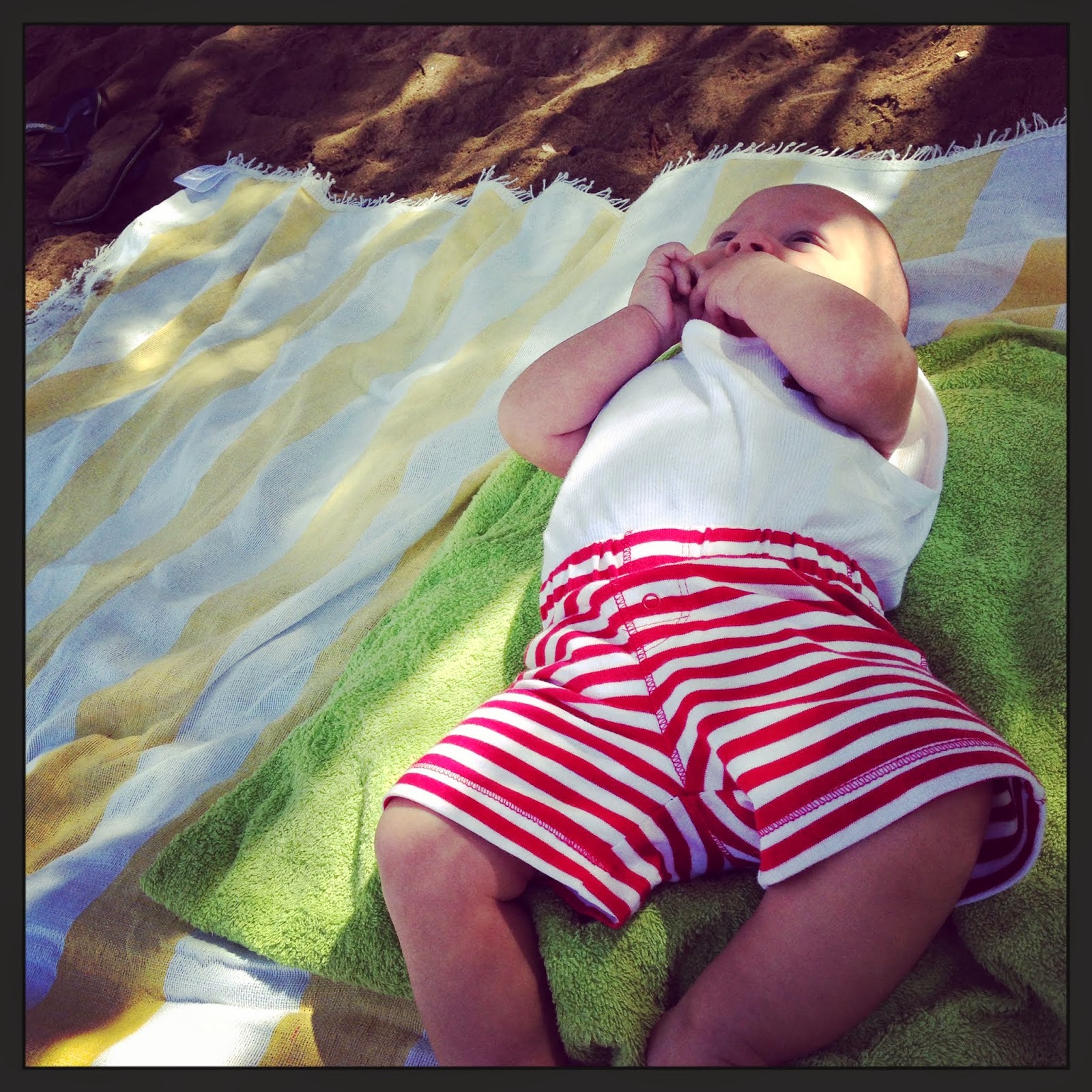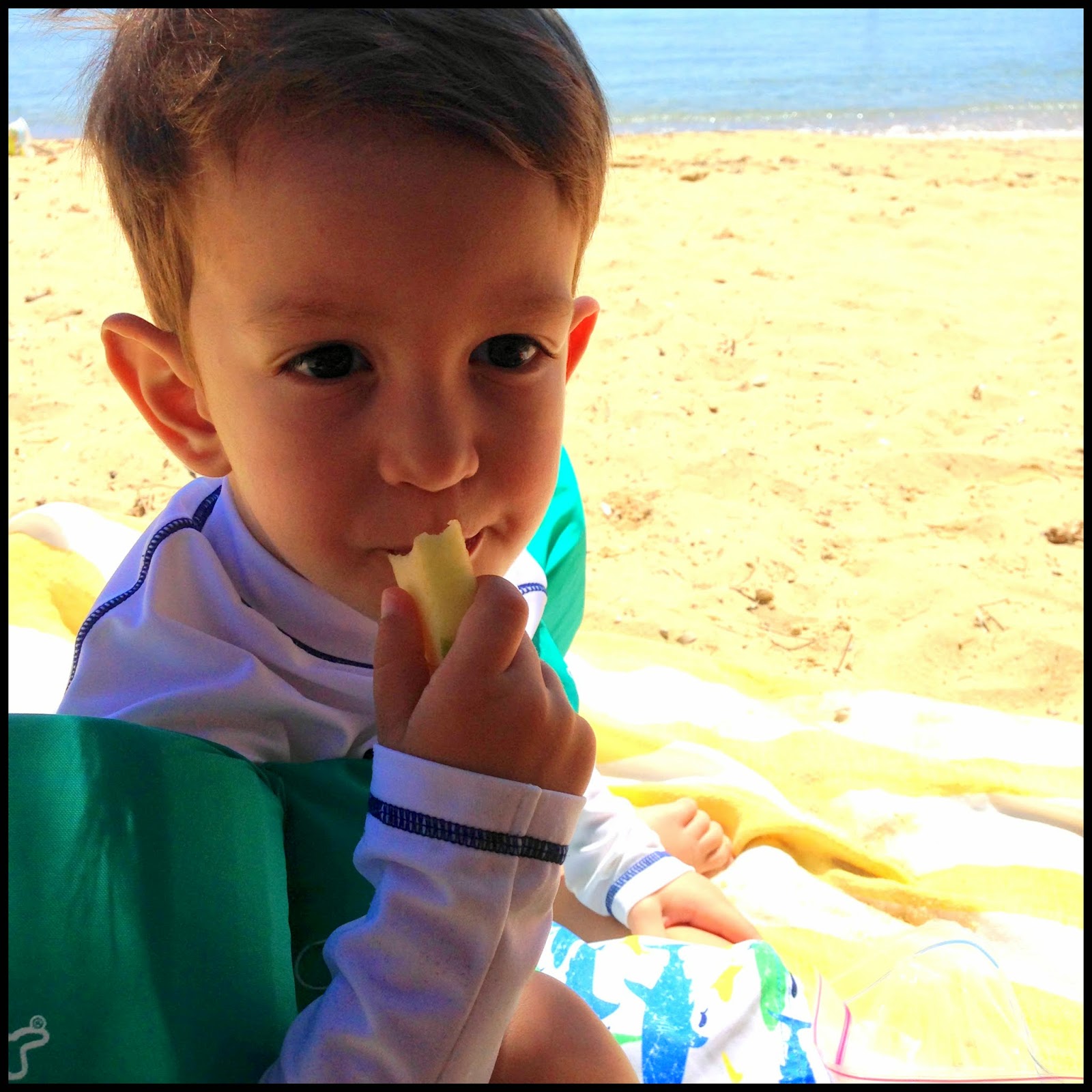 Then it was off to the beach. It was heaven not having to put up that tent. But on the downside it wasn’t fully shaded for Malcolm, the sand under the tree was black which led to lots of mess and the tree was leaking sap. Trust me, I realize how ridiculous it is that I’m complaining about anything while on a beautiful Mediterranean beach.