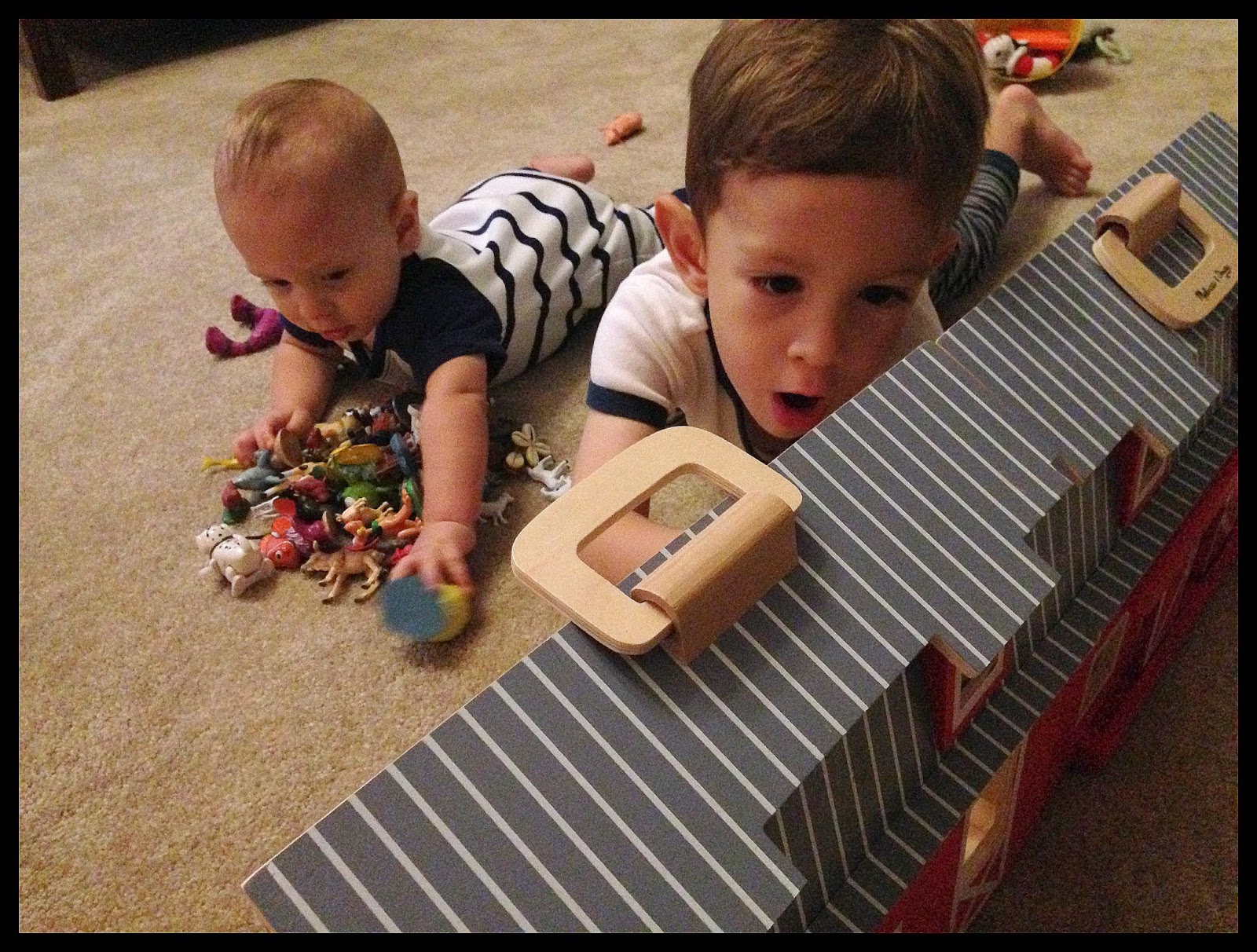Adam LOVES farms lately. He loves barns, horses, animals, animal sounds, tractors and all things farm related. Grandma Yuyu arrived last week and gave Adam a big red barn. Adam loves it! Malcolm just loves the opportunity to put small toys in his mouth, I jest people, we only give him the large ones.
