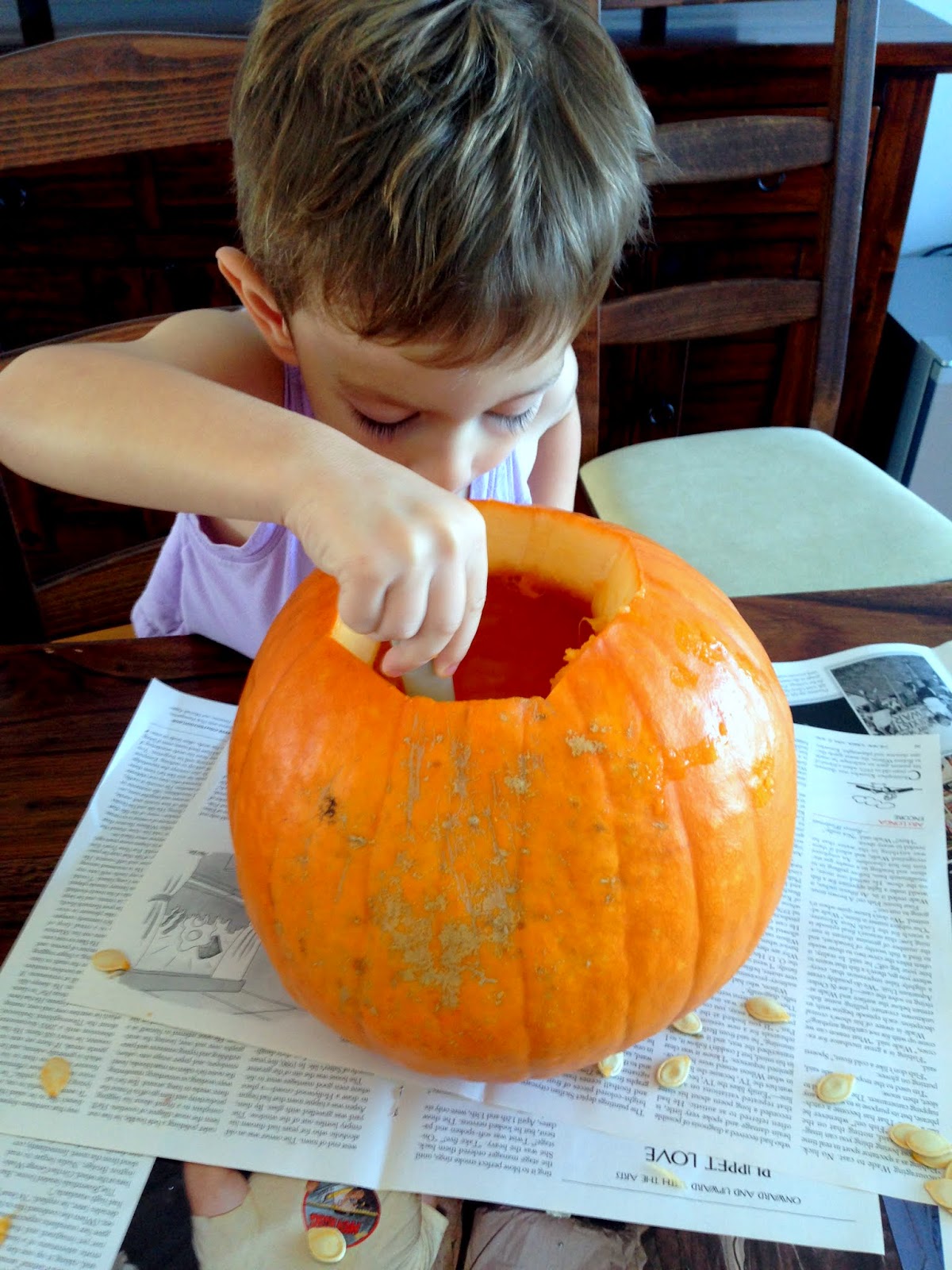 The Halloween festivities continued with some pumpkin carving at home. Adam was sort of into this. He’s not a big fan of seeds…its been a ongoing uphill battle to convince him he can eat the white watermelon seeds. We’ve now convinced him they are part of the watermelon and can be eaten. But here we had some seed pulling out which involved getting his hands super dirty, something Adam is not into. He was more than happy to watch daddy pull out the seeds. Although he did get into when I gave him a spoon to help scoop.
