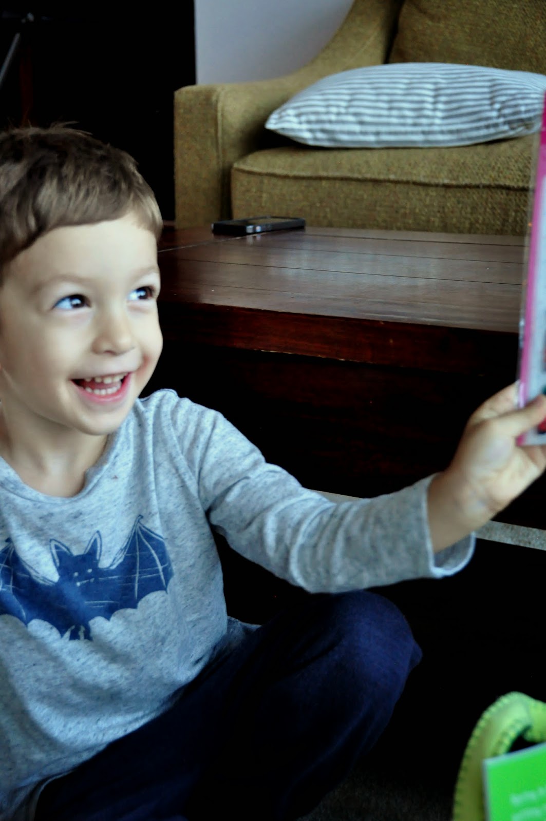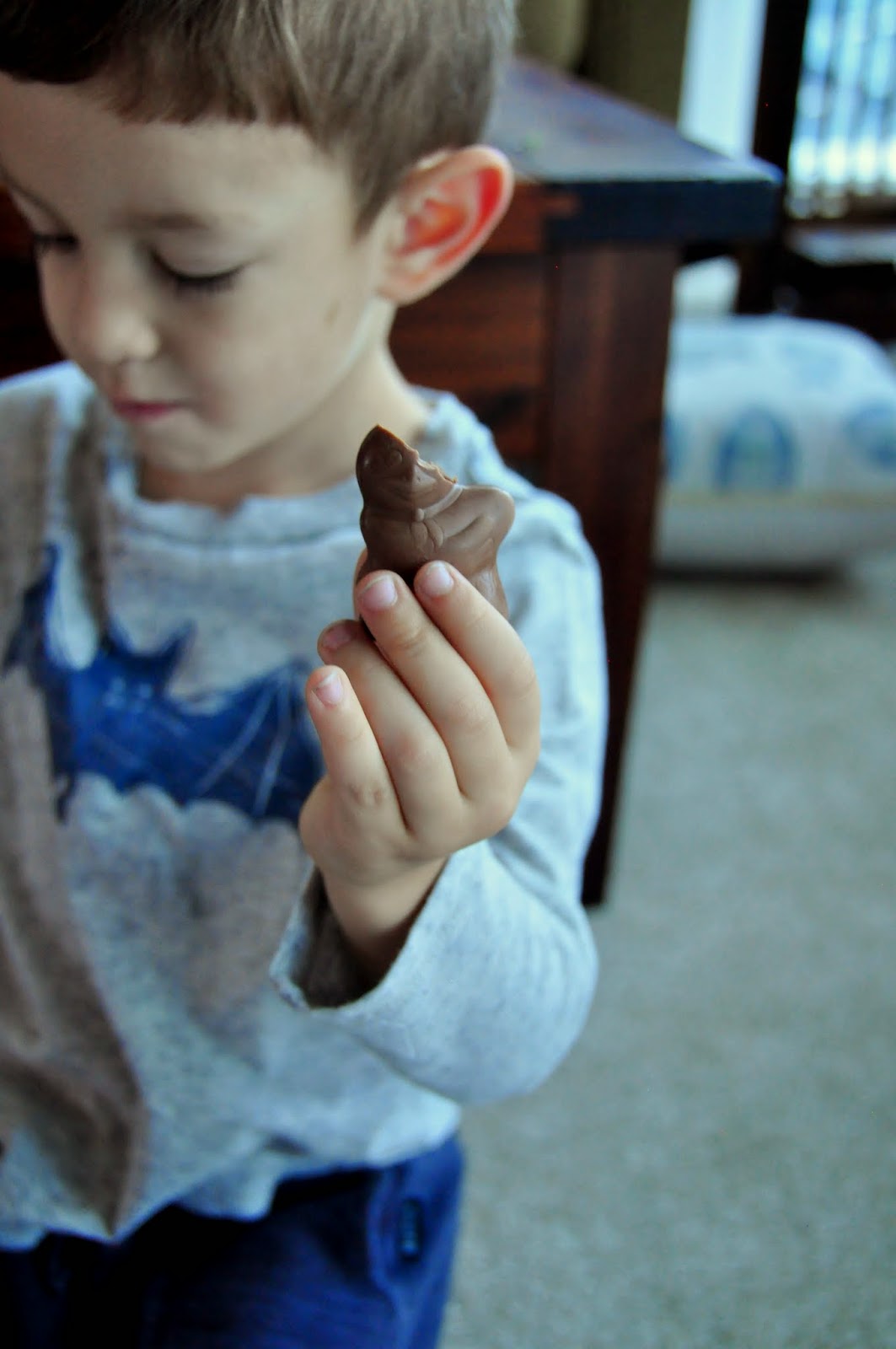 And then people, this is what happens when a three year old eats only chocolate for breakfast. Malcolm, who had been fully occupied with his new Easter book decided to go in for one of Adam’s eggs. We asked Adam (who had found all the eggs) to share one with Malcolm….