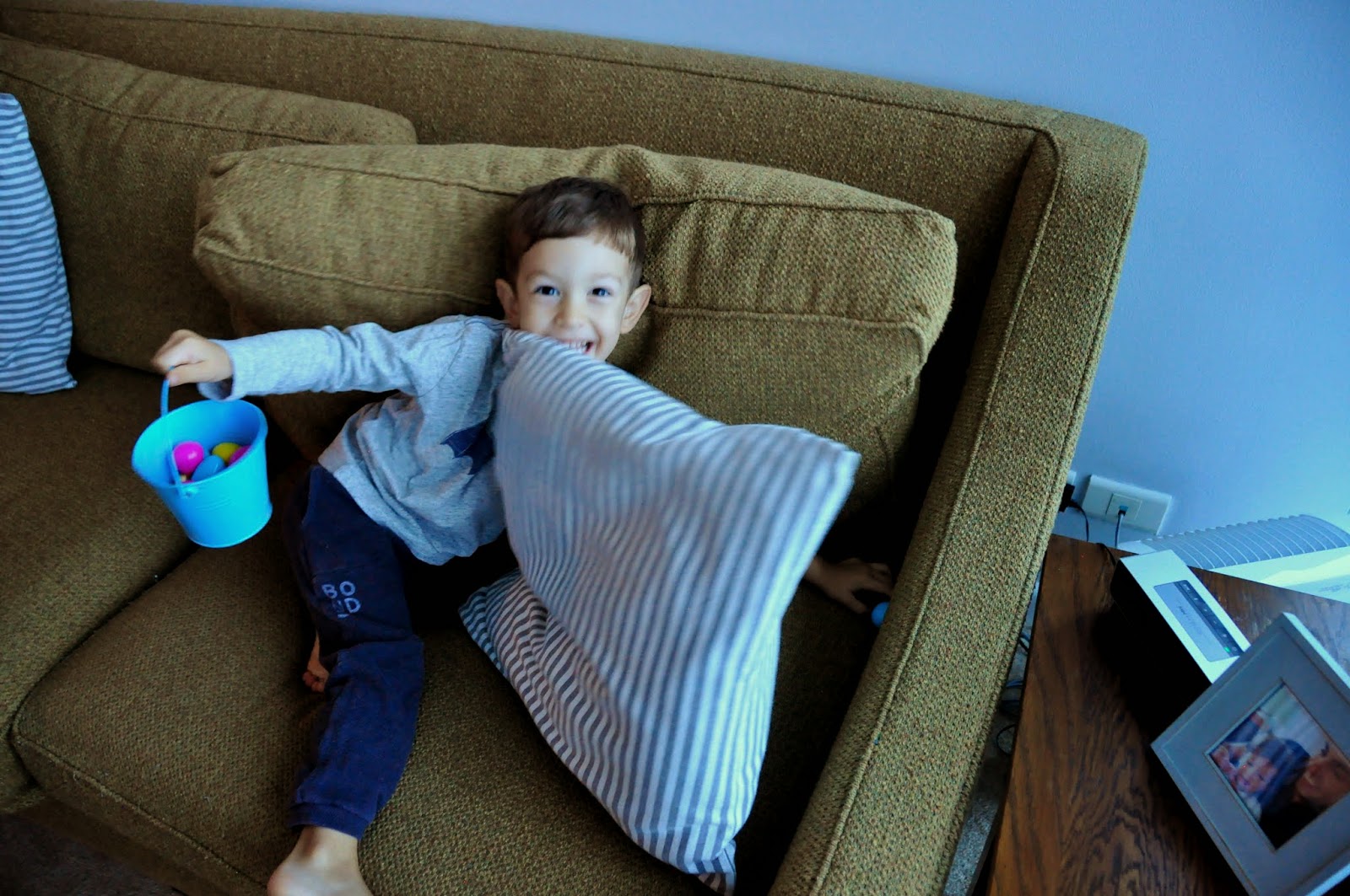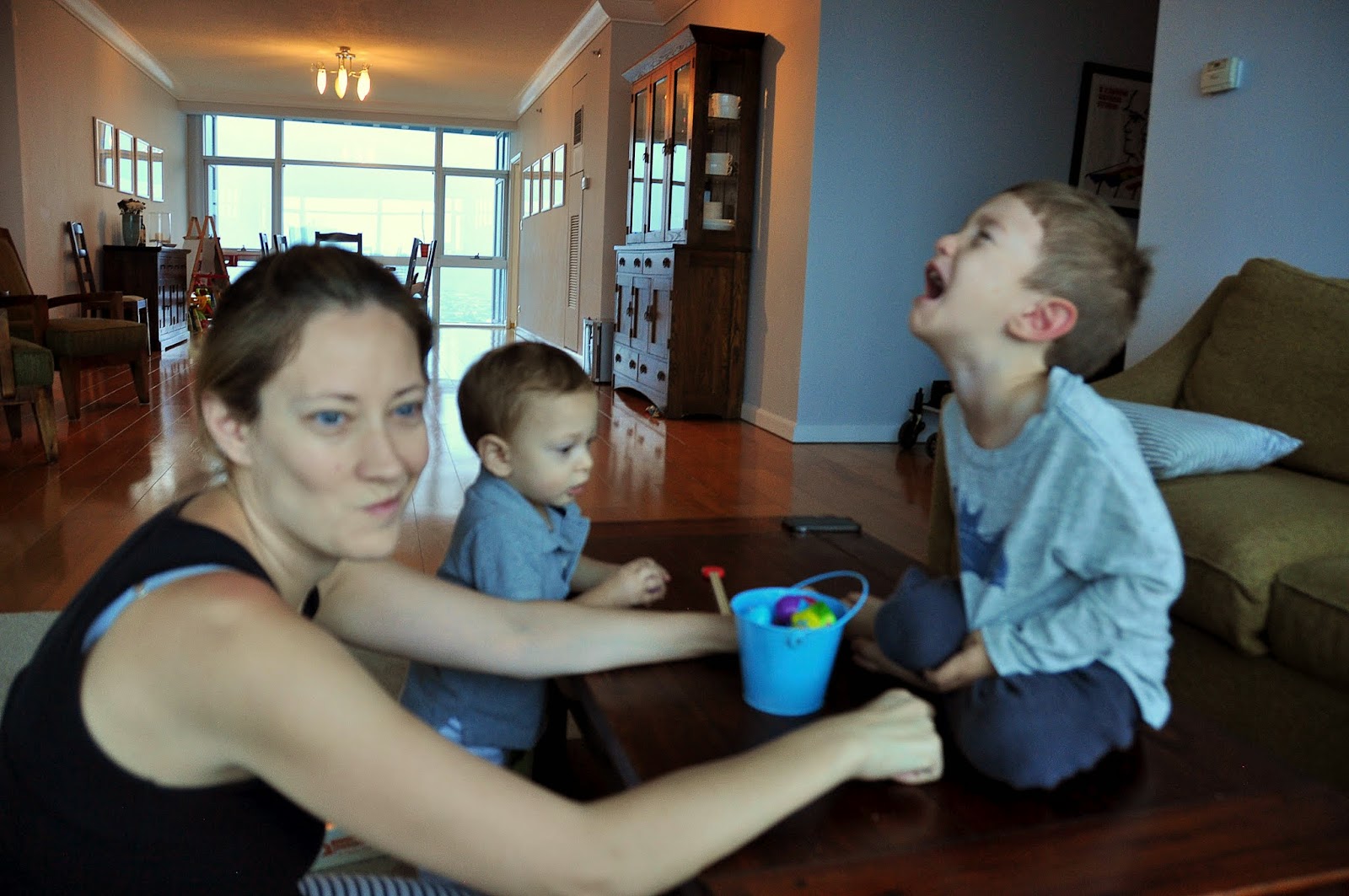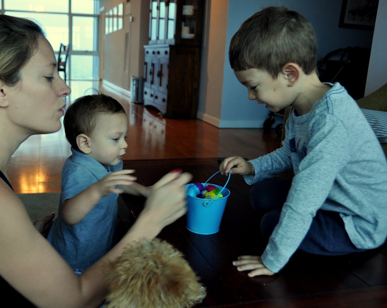 Then it was on to our Easter baskets. Each boy got a new Easter book and a couple of little treats, horse stamps and a board game (thanks Grandma Gertch) and new cute matching bathing suits from Aunt Sandra, Uncle Shawn and cousins Roman and Isla.