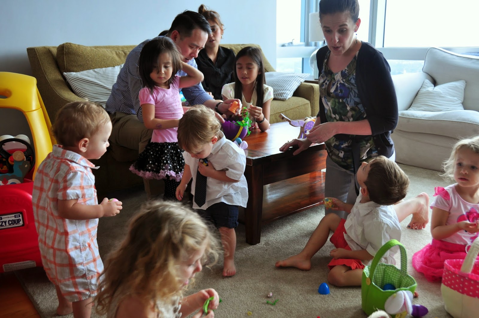 Adam LOVED it! He found all the eggs. Malcolm was much more interested in the books. He’s really gotten into books lately and loves to bring them over to us to read. You may be wondering who that cute dog it- his name is Cider, he’s a poodle puppy. Our friend is looking for a home for him and we decided to have a trial run. The boys LOVED him and he was a very sweet puppy…but…we decided to wait a couple of years. Anyways…back to Easter!