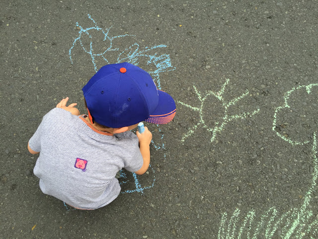 The boys took their bikes down and rode their little hearts out. Then they spent almost an hour drawing with chalk. We even played some hopscotch. Which yes, quickly evolved into the boys finding the heaviest rocks they could find and throwing them dangerously far….lesson learned next time use a bean.