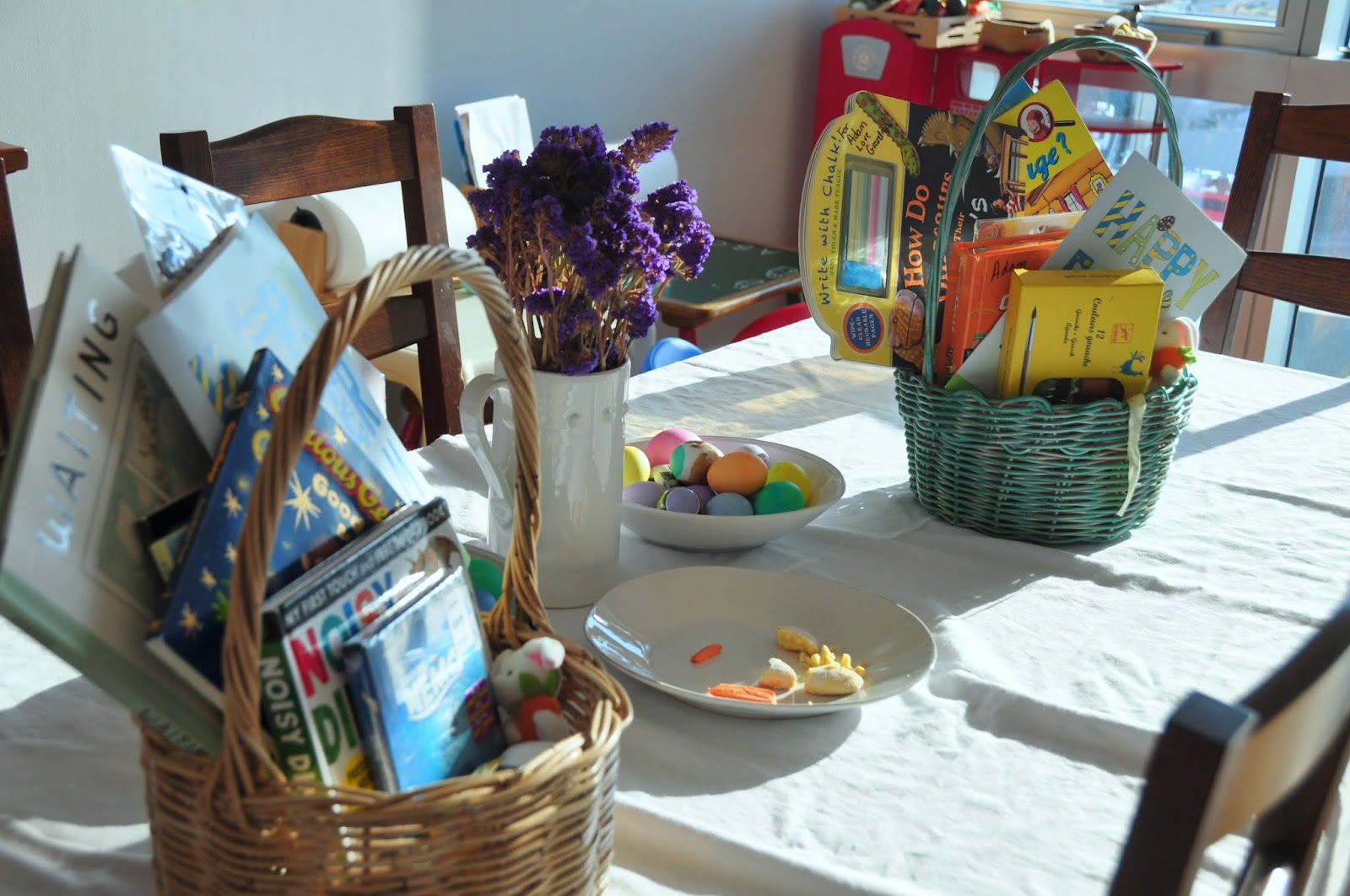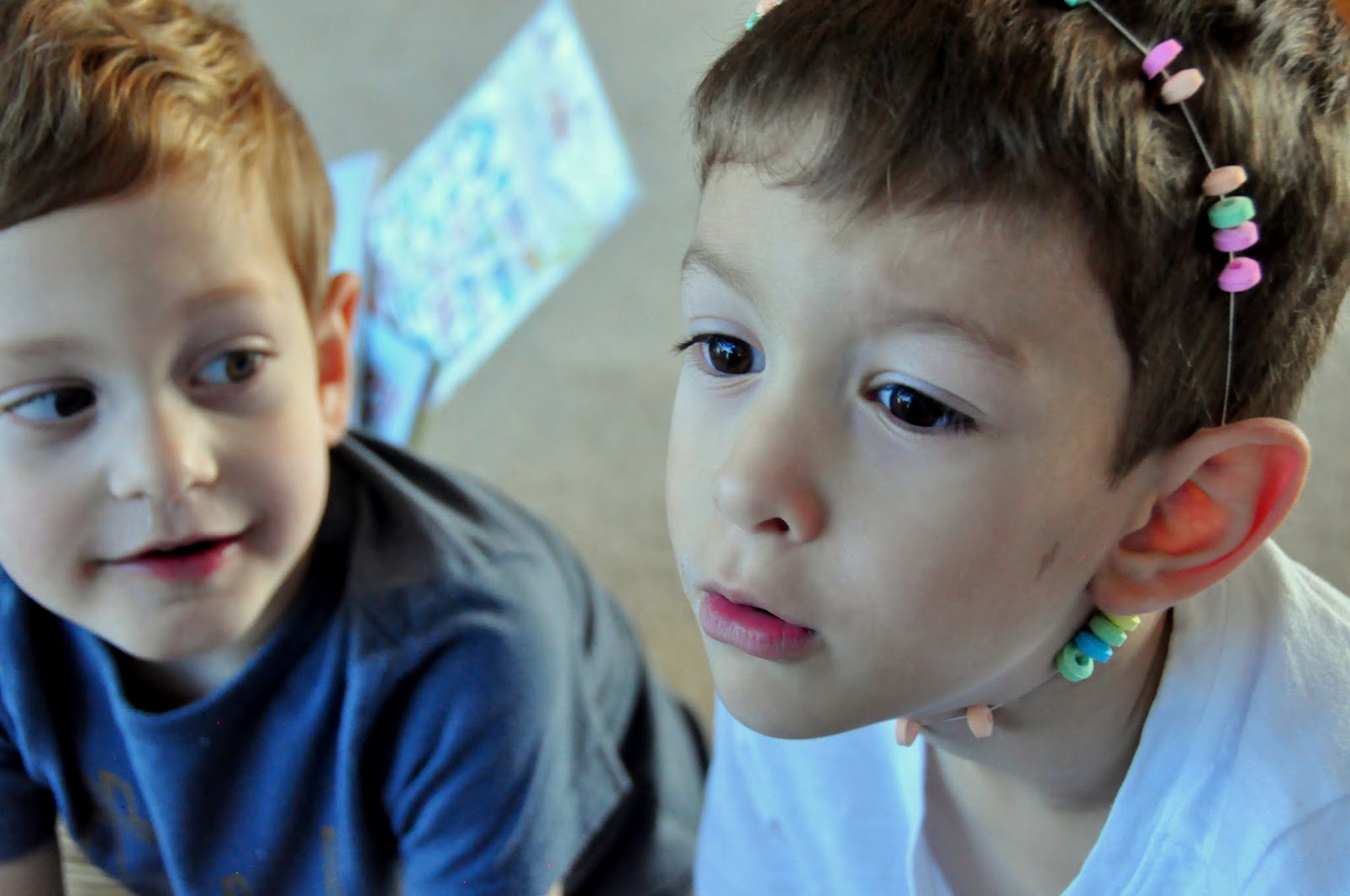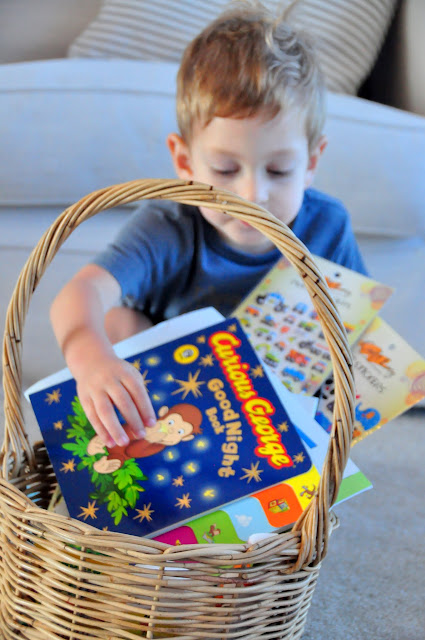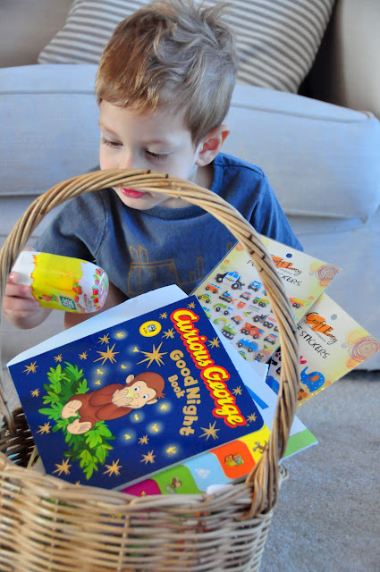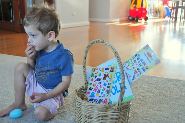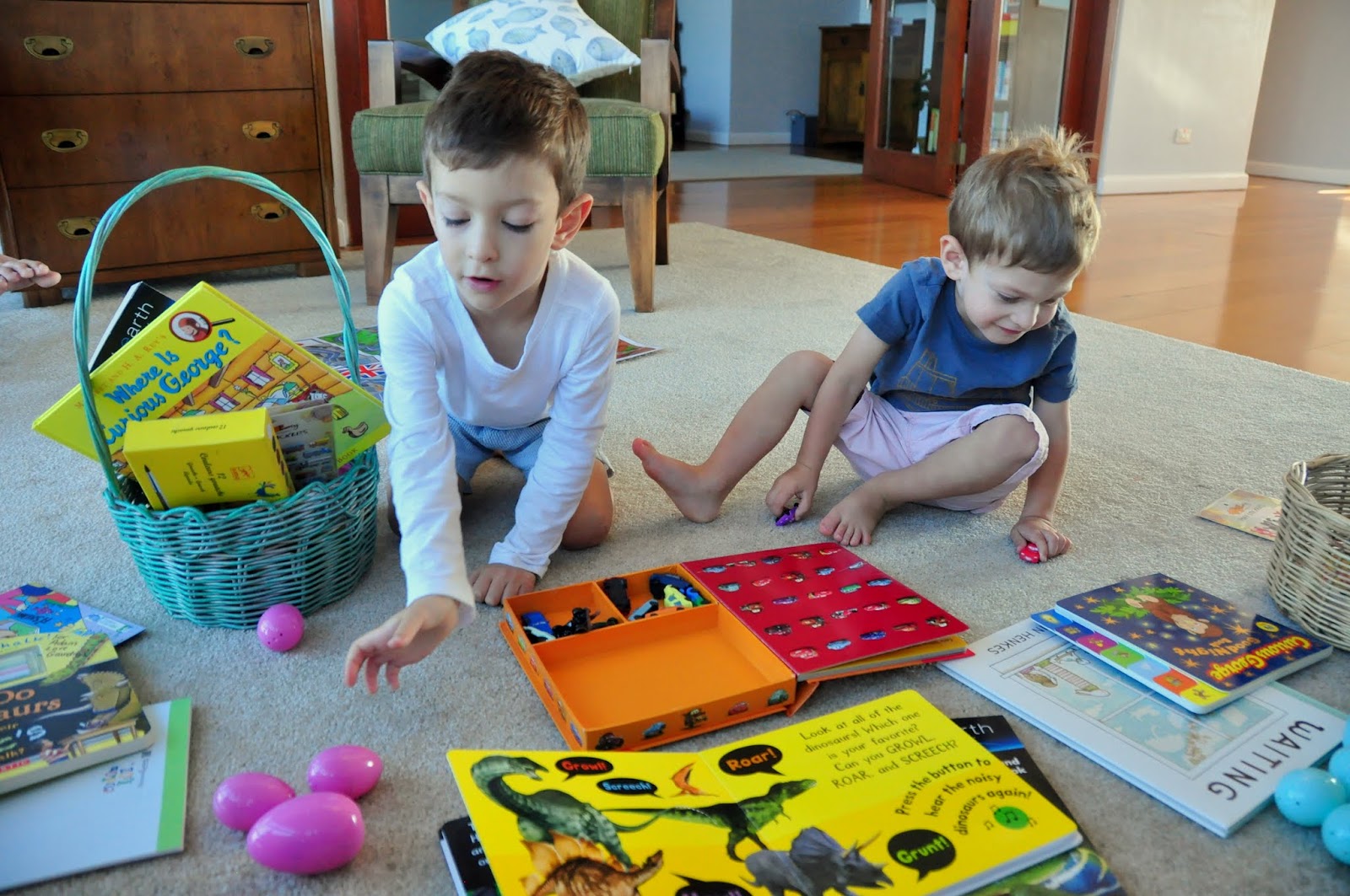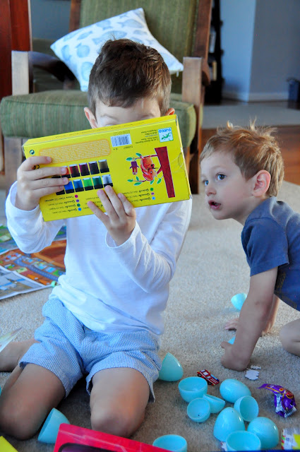 Then it was on to Easter Baskets. These were mostly books and games and gift our wonderful friends and family sent. Some were sent for Easter and some were just sent and I squirreled them away for a rainy day. That day arrived and the boys loved everything! Aunt Sandra, Uncle Shawn, Roman and Isla sent the boys the cutest personalized Easter books. The boys LOVED these! They were so excited to hear and read their names in the coloring books and immediately set to work coloring in all the Easter eggs.