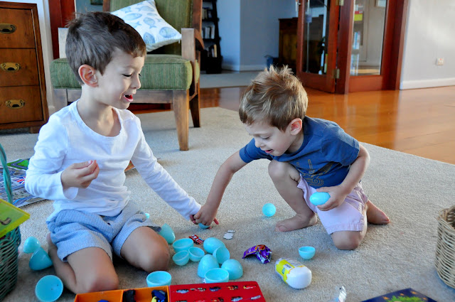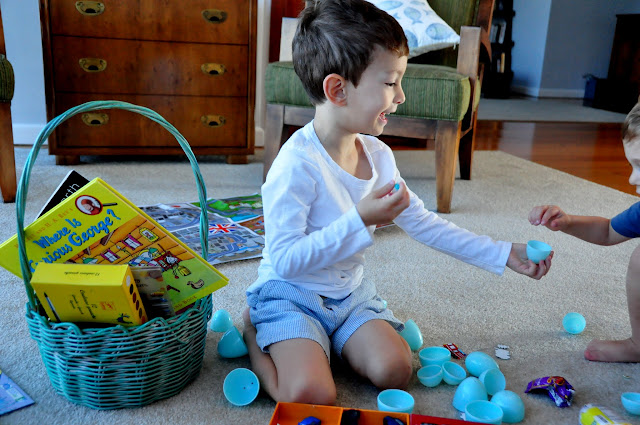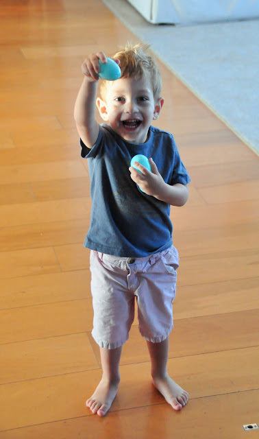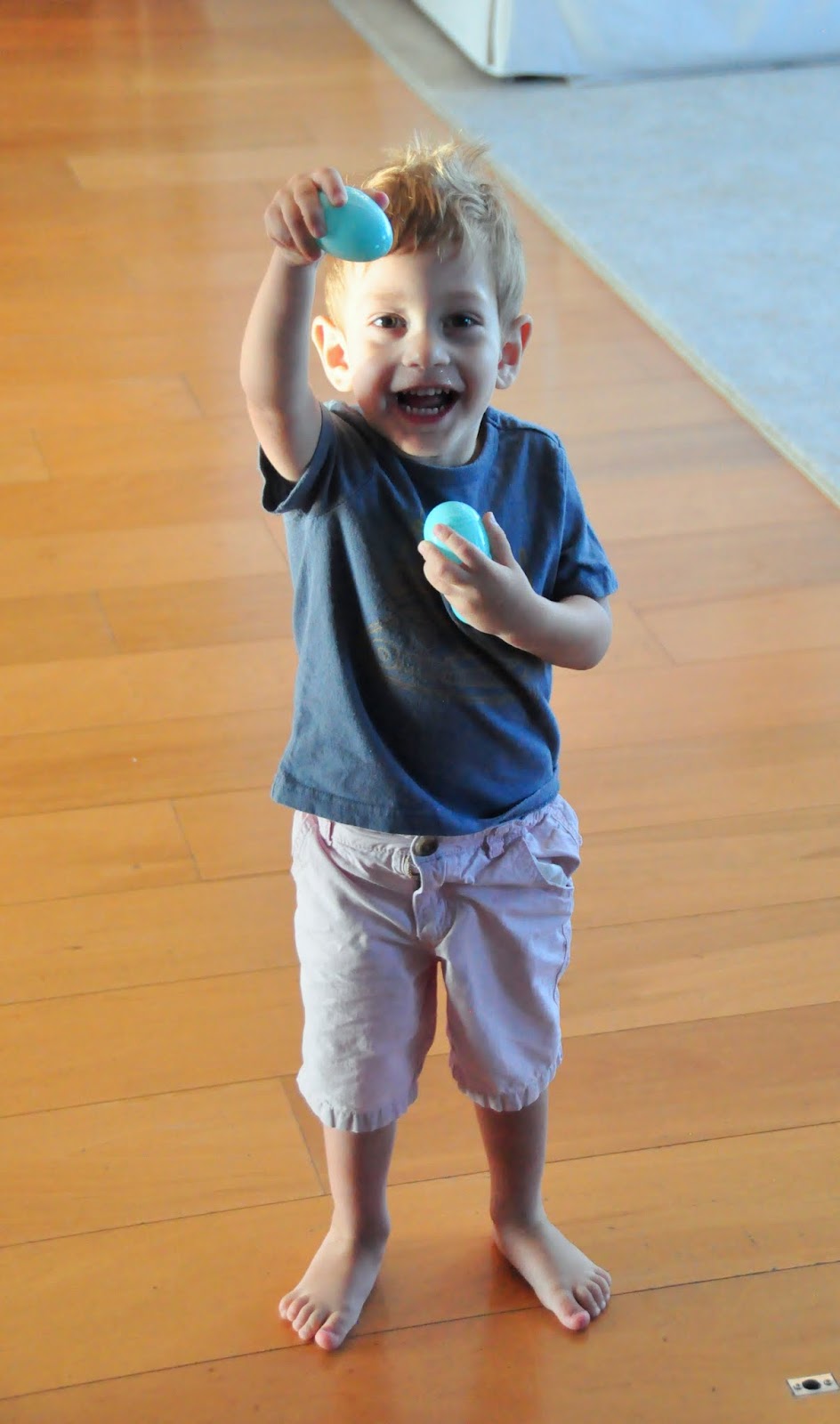 Then it was time for the egg hunt! I decided to hide each boy 10 eggs and color code them. Adam’s were purple and Malcolm’s were blue (their favorite colors). This was inspired by my brother, dear Uncle Ari, who used to wake up at 4 a.m. on Easter and sneak down to see where all the eggs were hidden. Then at the starting bell (when my parents finally got up and had their coffee- sorry guys for not sleeping in, I now know how you feel!) Ari would shove his little sisters aside and gather 99% of the eggs.