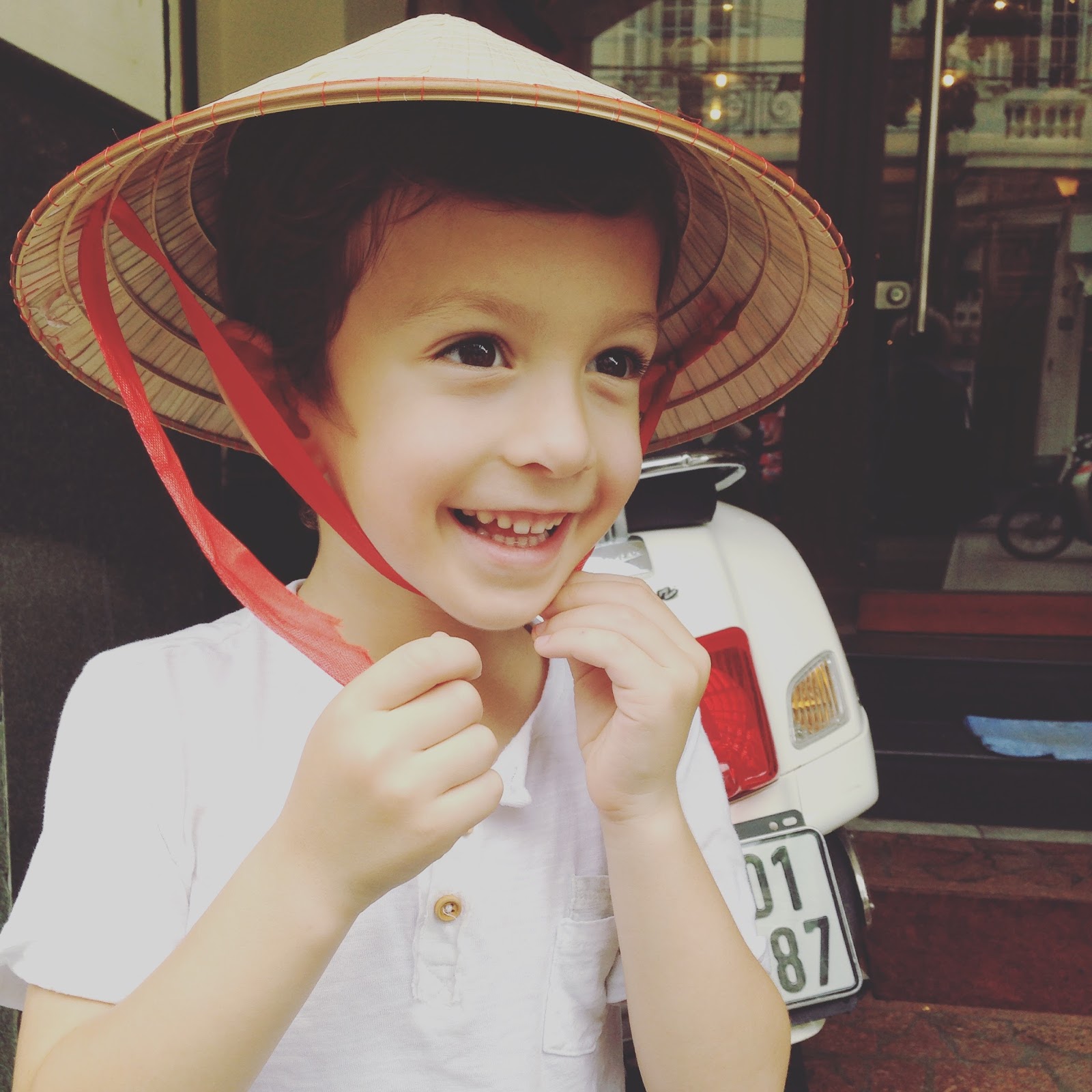 As a veteran of late evening flights, yes, there are usually only half full and give you more space for privacy. I have yet to visit Vietnam, but Aileen told me that the food is great. The Vietnamese hat looks cute on Adam!