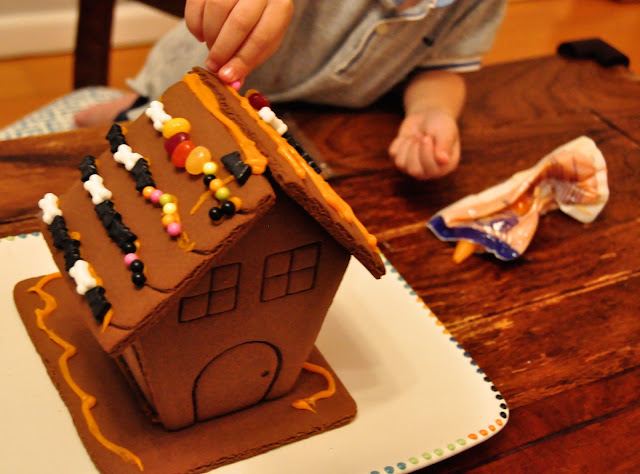 It is also super exciting for the boys. They’ve never seen a gingerbread house, since I am just not skilled enough to make this from scratch. They were so exited I let them make it the day it arrived, even though it was a Monday. Most of the decorative candy ended up right in Malcolm’s mouth, but a few made it on his side of the roof.