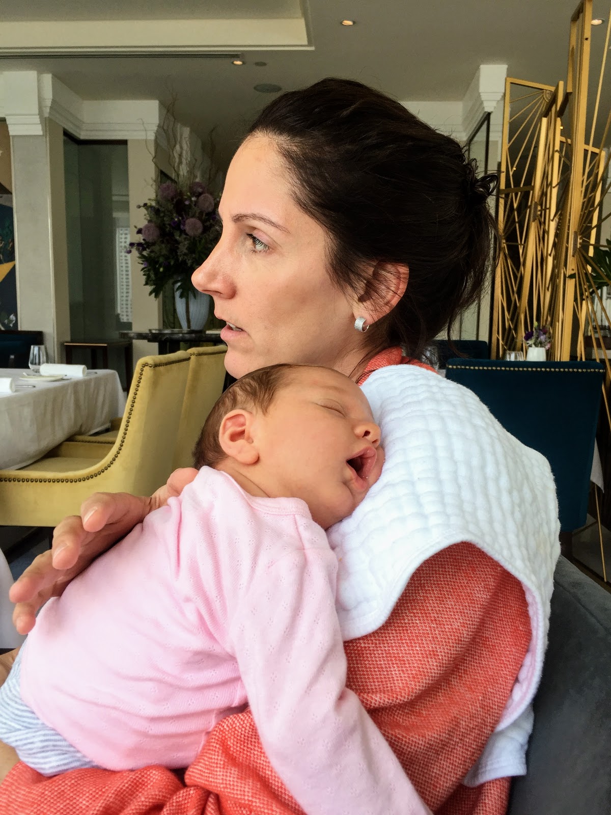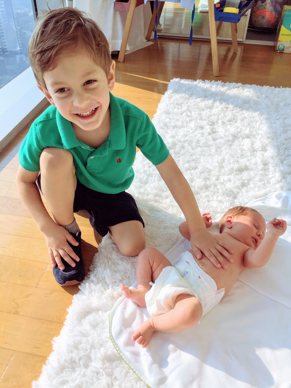Week 3: First visitor from out of town, Kate came to see us and meet Miral! Daddy went back to work and left us girls at home alone while the boys are in school. An even longer stretch at night- 6 hours! A trip to the embassy to get Miral’s passport. Girly clothes make an appearance finally! Trip to the pool with the boys to watch them swim. Fancy brunch out with Kate and mommy and daddy. Photo session with her brothers. Yummy tortellini in brodo from scratch made by Randy! No longer kept in by blanket swaddles. Grabbing at necklaces and toys already.