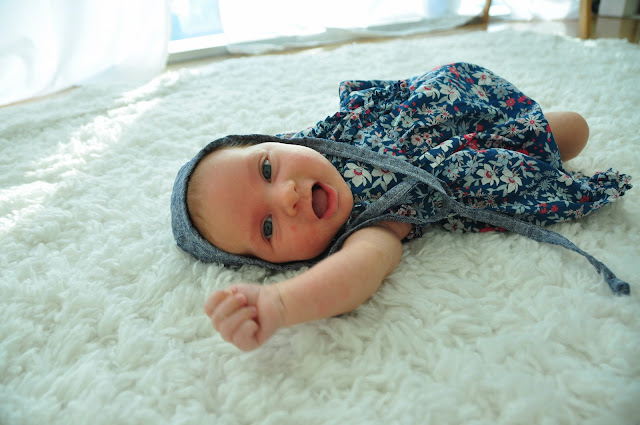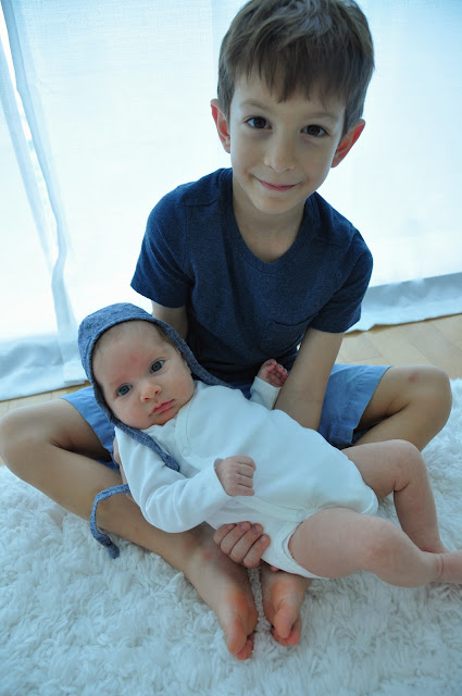 Week 7- You have a bedtime! I forgot how early babies go to bed…. we’re currently ready and start at 6 and end up going down around 7. You’re smiling so much and love when your family talks to you or sings to you. You’re growing and officially no longer fit into newborn clothes (tear). You’re starting to hold your head up and love to look around. You’re starting to notice things more and more. You’ll stop eating when you hear your brother’s voices….which is quite often! You still squish up your little butt when you’re sleeping on my chest and keep those little fists scrunched up tight but you’re starting to stretch out little by little and seem so very big these days. Your daddy is away for a 17 day business trip but so far we are doing ok, but we sure do miss him and his big smile. While the boys are in school we’ve been taking walks mostly to Starbucks, but this week we walked all the way to the flower market, about 30 minutes away, and you were great.