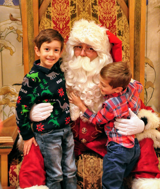 After a short wait it was our turn! Malcolm all of a sudden wasn’t scared and went right up to Santa and with some help from Adam told him what he wanted. Adam was ready and went right up and sat down on Santa’s lap. He was so sweet and helped Malcolm remember what to ask Santa for. I loved looking at these pictures later and seeing Malcolm feeling Santa’s beard. Malcolm loves soft things and loved rubbing the beard. Santa may not have been so pleased, but luckily he was a patient Santa.