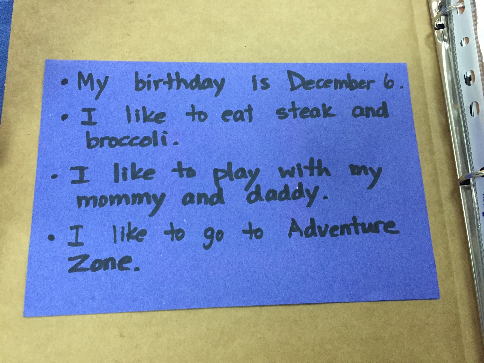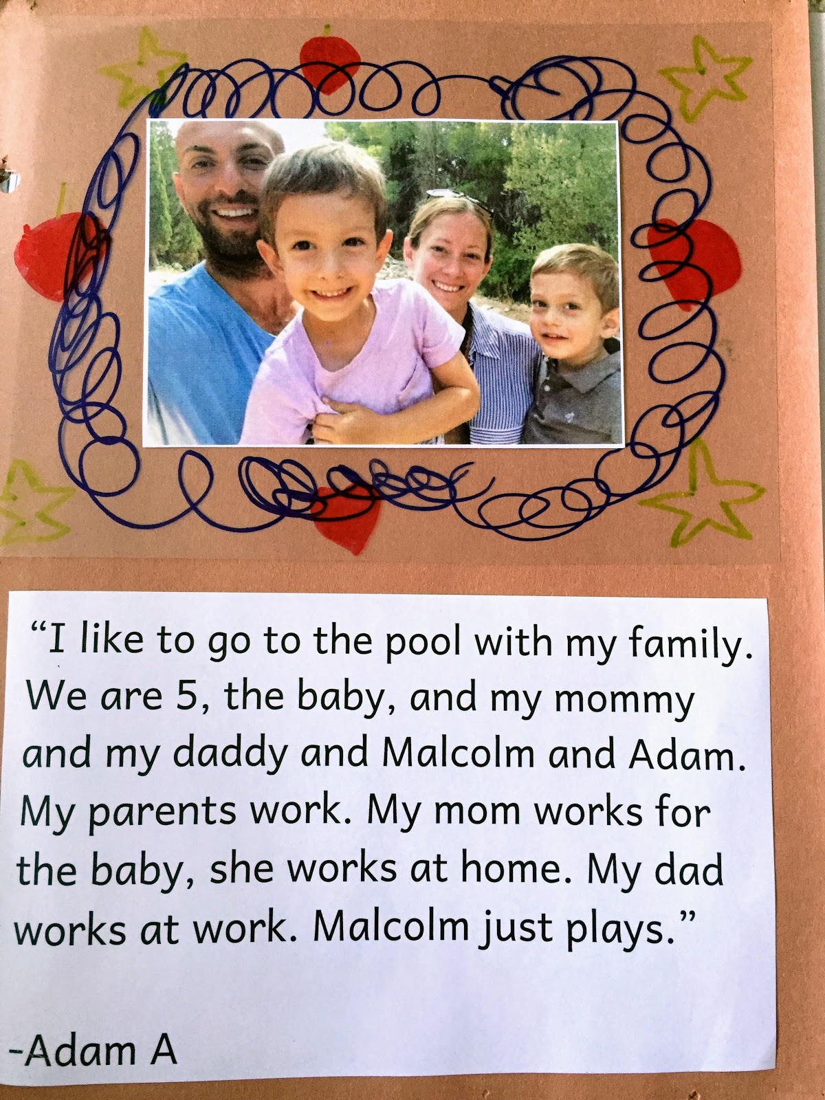 Adam’s words (Mira’s not pictured because she was born 12 days after Adam started school and this picture was brought in the first week but written two weeks later, when I in fact did work for the baby).