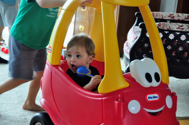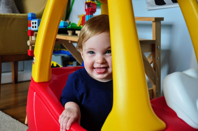 Week 46- I wasn’t sure if you were ready for the Cozy Coupe that has been through three kids but turns out you were more than ready and OBSESSED! Luckily Adam and Malcolm are more than happy to push you around and around and around. You sit there laid back with your foot up relaxing and enjoying, and the minute someone stops you sit up and protest. Once the car starts moving again you lay back again and put your foot back up. You also love to try to climb in over the door head first. Luckily Grandma is here and was able to teach you how to open the door and climb in, so now you use the door most of the time. Remind me not to get you a mustang when you grow up, but something sensible like a Volvo!