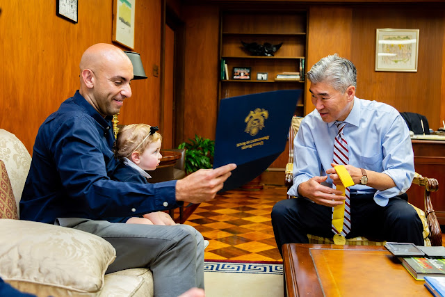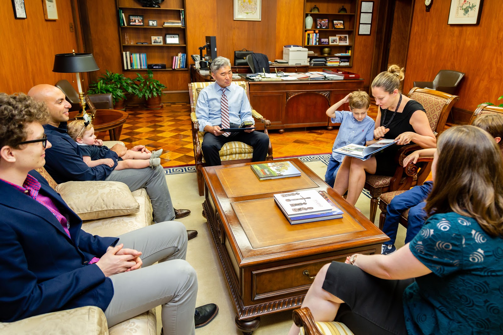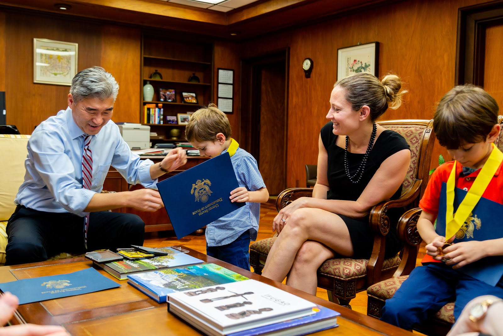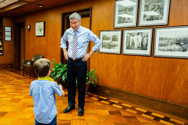 Like everything with kids, getting there didn’t go as planned. Adam is in a stage where he only wants to wear sweatpants and three t-shirts he likes. Normally I don’t care but I told him to go into the Ambassador’s office he has to wear real clothes (not jogging pants…) well an hour and a half later we were on our way. Adam only agreed to wear real clothes over his regular clothes with a few bribes. You can see in the photos below there was a quick outfit change after where Adam ripped the top layer off to be in comfy clothes. But we made it and because I work in Public Affairs, my friend Paul, one of the Embassy photographers came and took some photos for us.