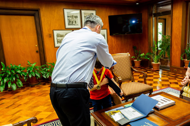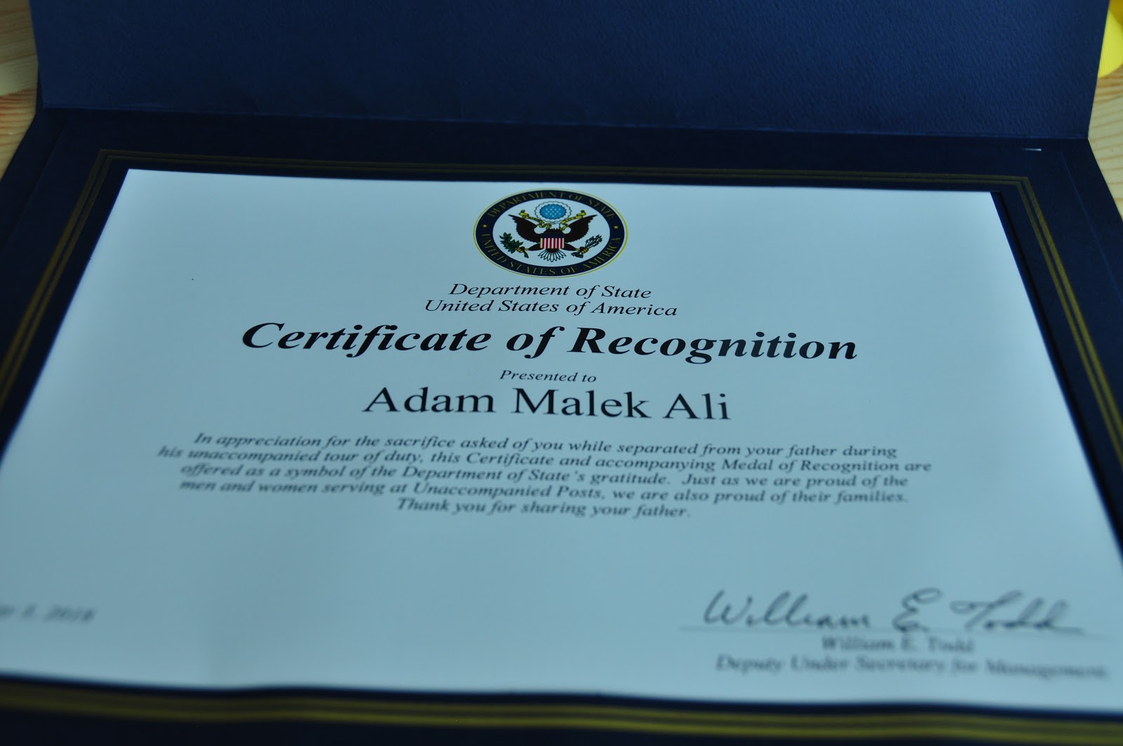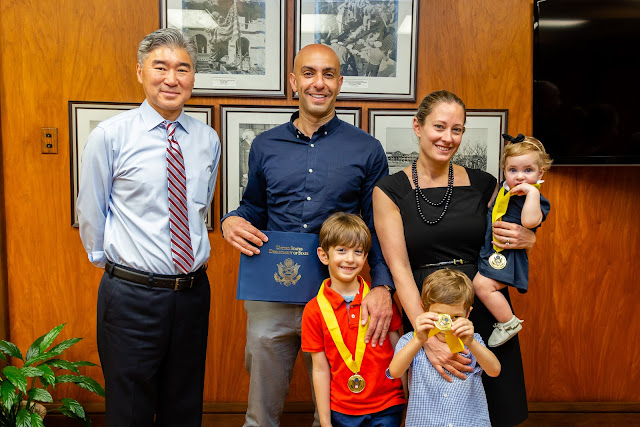 To thank kids in the Foreign Service whose parents are serving away from them, they have medals and certificates for the kids. It’s definitely not as good as having Randy around, but it was pretty special to have the Ambassador to the Philippines present the medals to the kids. And Randy was here and got to be a part of it. The boys have been really into medals and trophies so I thought they would like it and Miral likes to chew on stuff so I figured she could chew on hers.