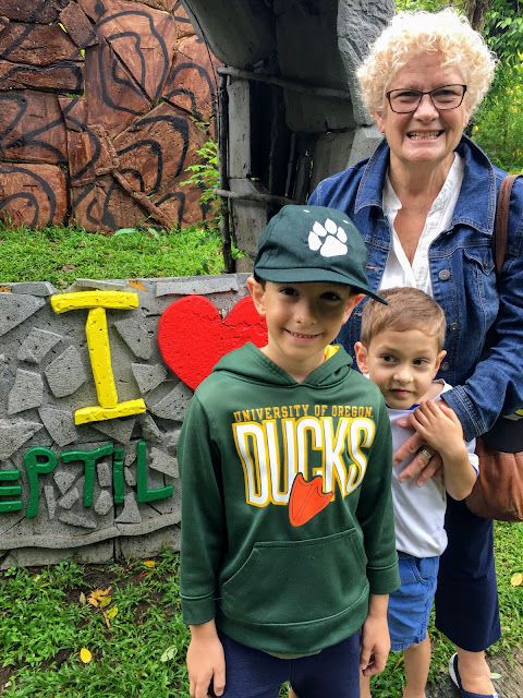 I’m taking it way back to last summer when Grandma was still here. We took an overnight trip to Tagatay. which is only 50 Kilometers away, but a three hour drive because of traffic. The kids were great and we headed right to Reptile park. One of the great things about being in the Philippines is that my kids have very reasonable expectations for children’s attractions. Reptile Park left alot to be desired. There was one live snake and two live monkeys *not a reptile. The rest of the reptiles, were mechanical. Still the boys LOVED it!