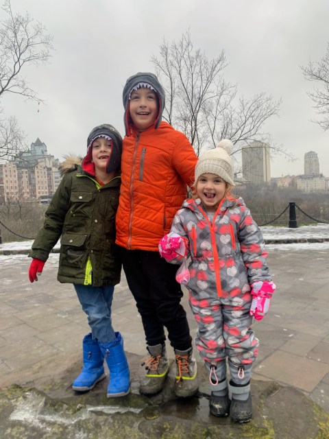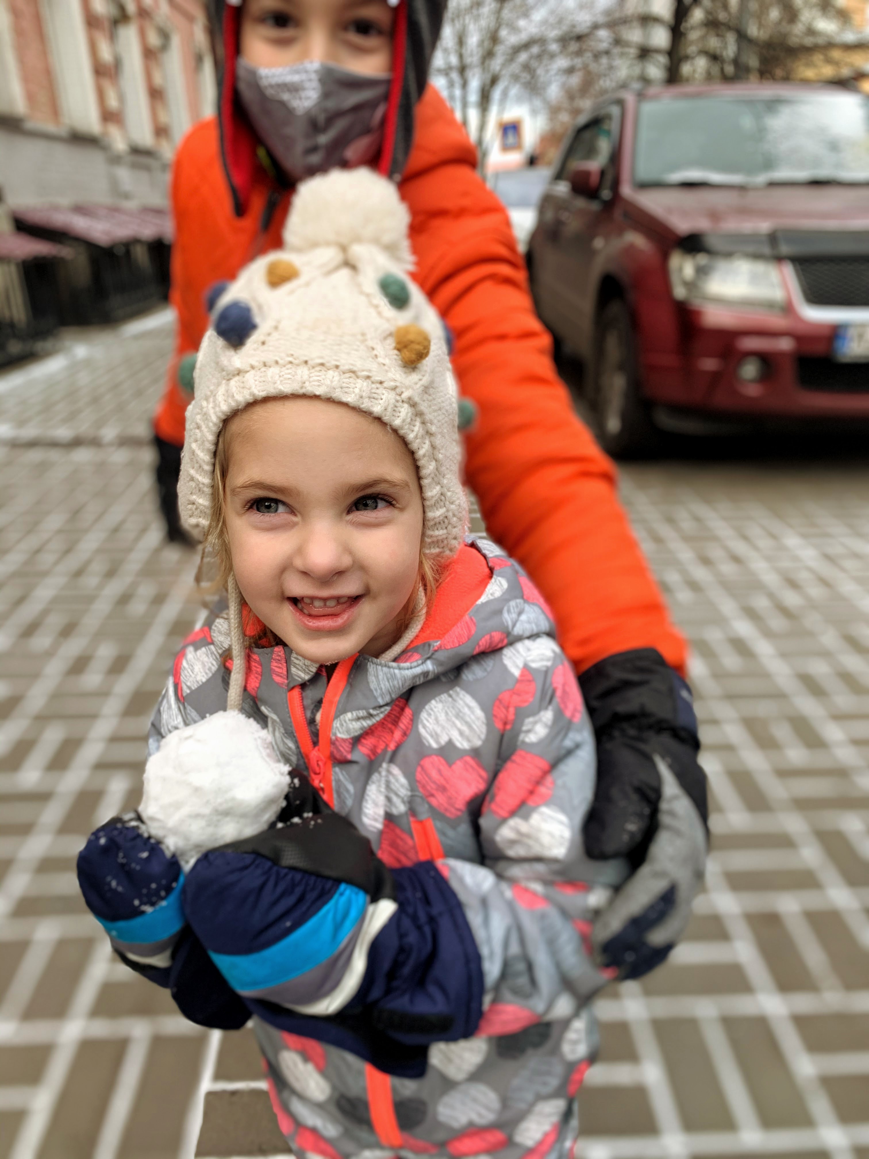We broke out all the winter clothes and we had our first snowfall. It was just a sprinke but it was enough for snowballs.